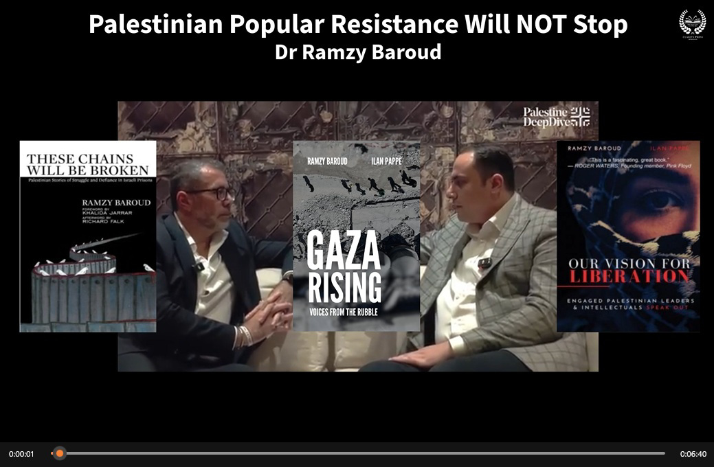 Ramzy Baroud is interviewed on Palestine Deep Dive. He addresses the struggle since its inception, as the legacy of Palestinian ancestors, who at first as simple farmers, just wanted their land back, resisting without ideology.. |
